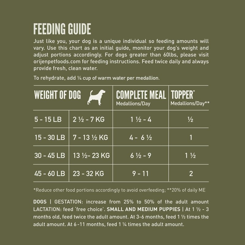 - ORIJEN freeze dried dog food is a concentrated source of animal protein that can be served as a meal or used as a dog food topper