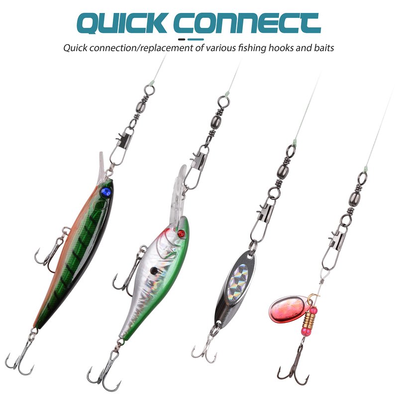 - QUICK CONNECT: 2-in-1 fishing swivel snap design for quick replacement of various fishing hooks, baits, leaders and lines in seconds. Save time from different fishing gears together.