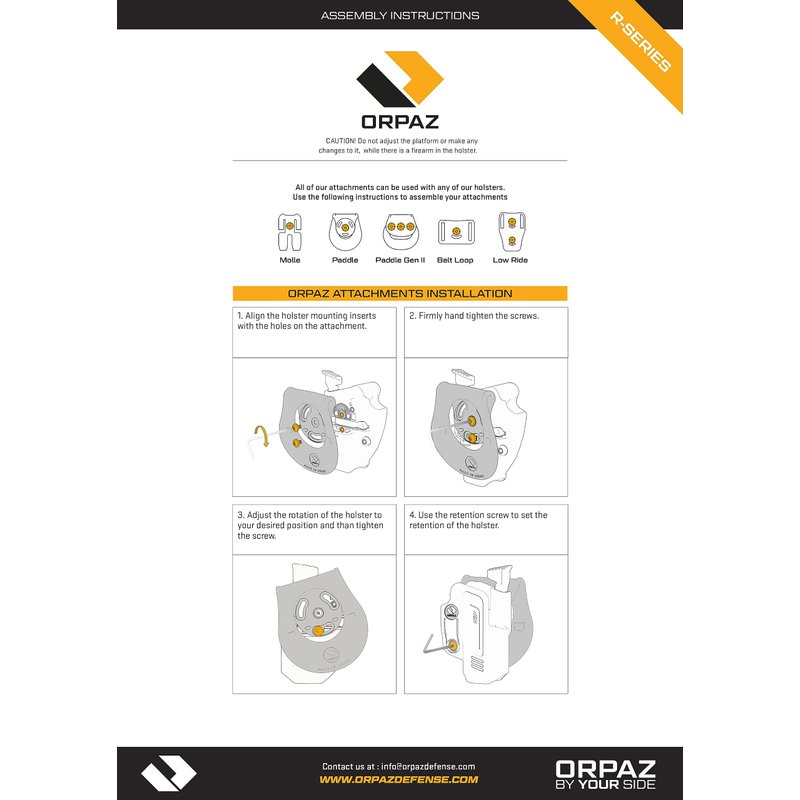 The Orpaz R-Series Sig P320 Holster is fully adjustable for retention and rotation with the Allen key included, and is compatible with all Orpaz attachments and adapters.