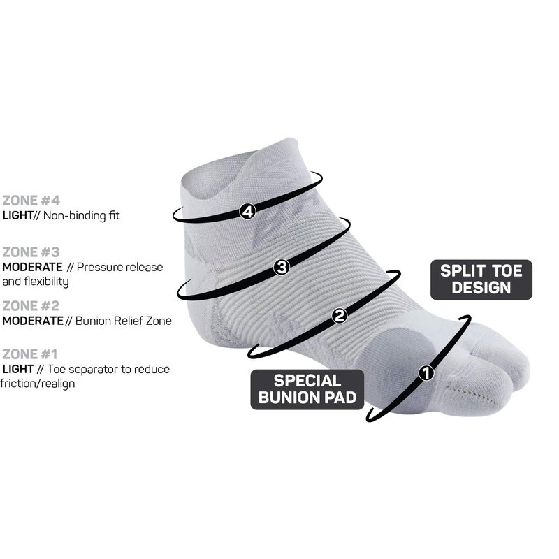 - PERFORMANCE FEATURES: Bunion therapy in a performance and comfort sock. Provides continuous relief from bunion pain, toe friction; Supports the arch & overall foot structure; protective, supportive, and comfortable split-toe design makes this a go-to for relief and comfort during any activity.