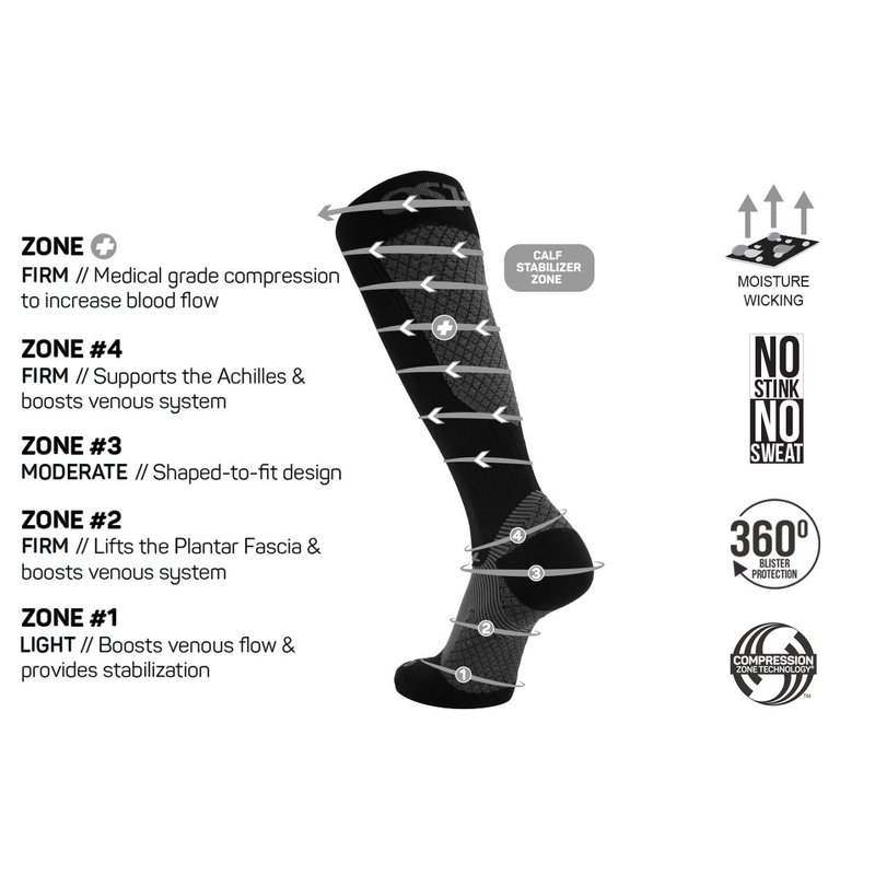 The FS4 Plantar Fasciitis Socks are the first ever Plantar Fasciitis sock to be internationally patented. Using the same technology as the award winning FS6 Performance Foot Sleeve, these socks are specifically designed to keep you on your feet and pain free. The FDA registered FS4 is incredibly effective at relieving the pain of Plantar Fasciitis, chronic arch and heel pain, Achilles Tendonitis or just swelling in the foot. This first and original Patented Plantar Fasciitis socks feature award-winning Compression Zone Technology in each sleeve. Wearing the FS4 PF socks during runs or sports activities will aid in preventing PF symptom onset and act as an overall foot health and performance aid. With precise targeted compression levels, the FS4 features Compression Zone Technology that is designed for proper foot support and injury prevention. Add to that, soft, moisture-wicking fabric and padding in the right places which creates a technical performance sock that strengthens the foot structure and prevents Plantar Fasciitis, as well as, overuse injuries.