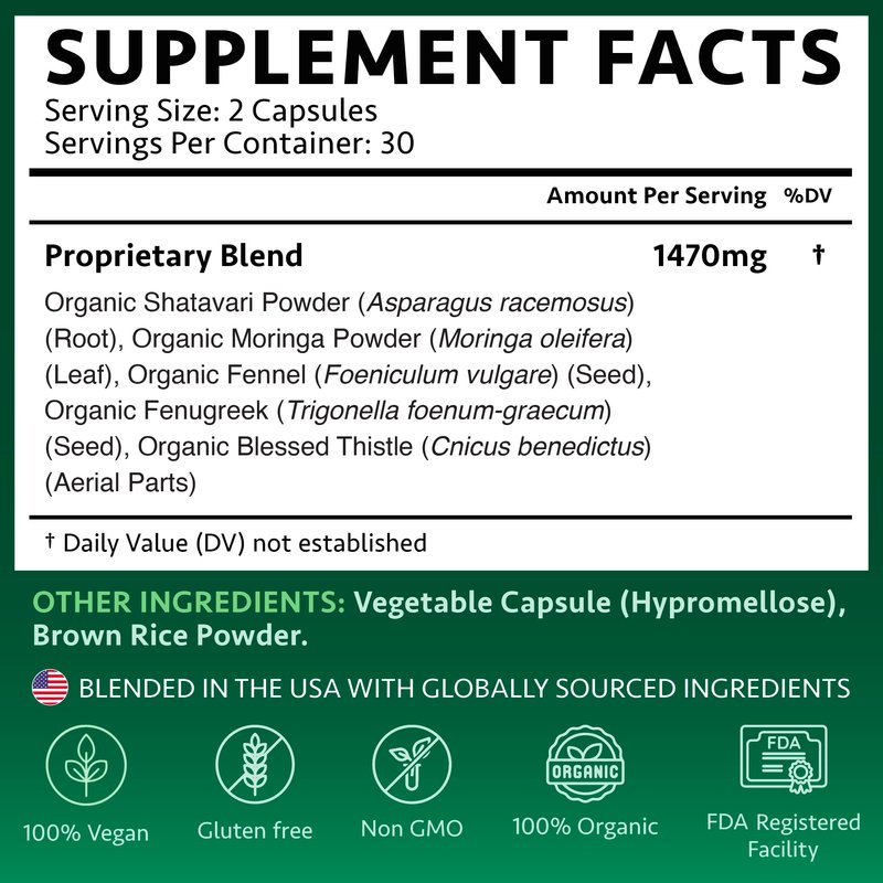 Increased Milk Supply: Combination of natural ingredients like Shatavari, Milk Thistle, and Moringa to increase milk supply. Helps with mom's nutrition and increases energy. Supports Digestion: The use of fennel helps to provide digestive support to moms. Reduces inflammation. Helps reduce Colic symptoms in babies when passing through breastmilk. Trusted: Made in the USA in a FDA-registered facility. Vegan and Gluten Free capsules. Made by Experts with 20 years of experience in helping women during a perinatal stage. HEALTHY: Restores nutrients lost during birth & breastfeeding, increases the fat content of breastmilk, and balances Hormones, and supports Postpartum Support. Organic: Heavy-metal tested, fenugreek-free, free of gluten, soy, corn, sugars, dairy, GMOs & other toxic ingredients.
