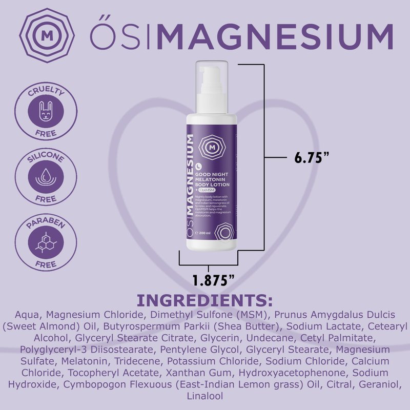 - DOSAGE: 1tsp of ŐSIMAGNESIUM Body Lotion + Melatonin contains 103 mg elemental magnesium, 650 mg OptiMSM, 1.5 mg Melatonin