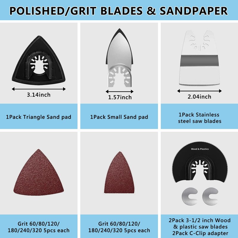 - 94 pack oscillating multitool blades: A totally cost-effective tool set including 10 different blades, 2 pads and 60 sandpapers. It can help you solve variety home repair or renovate work, perfect for wood/plastic/plaster/metal cutting and polishing.