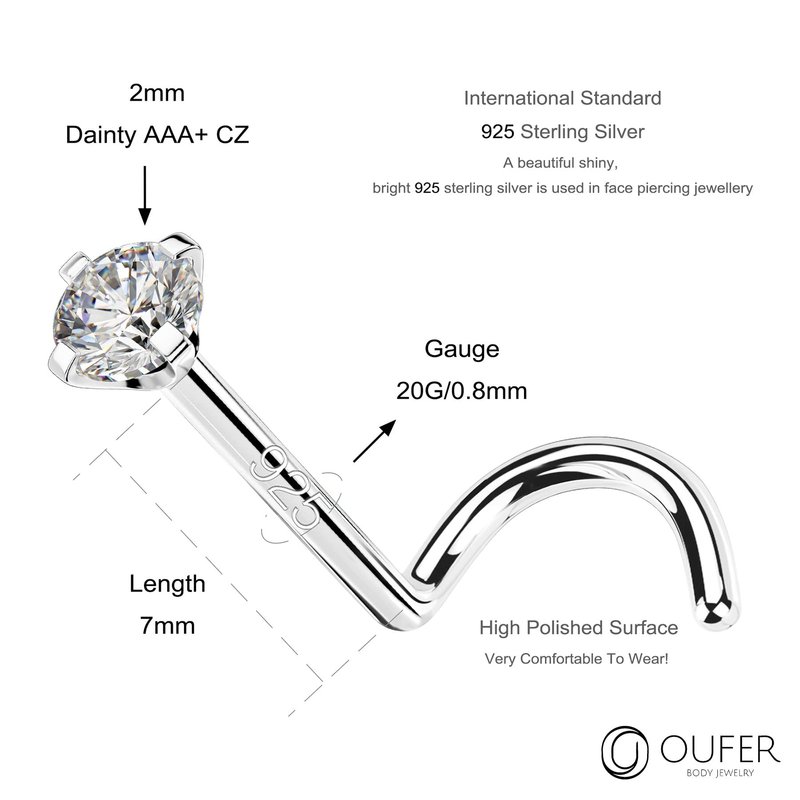 - [Silver Nose Rings Size] - Bar Thickness(Gauge): 20G/0.8mm, AAA+ Cubic Zircon: 2mm. A Standard Nose Ring Size.