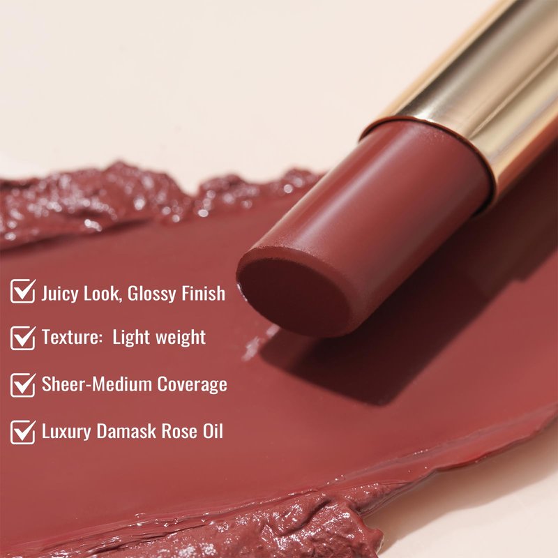 Enriched with 90% moi s ture emollient s and Rose Damascena Flower extract, this glossy tinted lipstick creates an effortless sweep of color and a luminous shine finish which nourishes the lips like a lip balm.