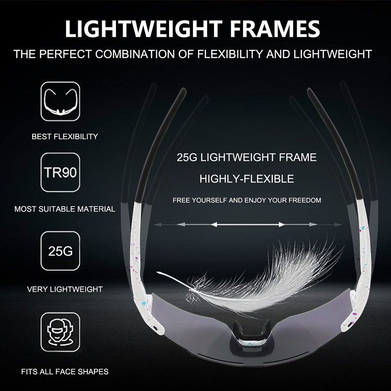 - LIGHTWEIGHT DESIGN:Our sports sunglasses made of durable and strong frame and uv protection lens lightweight design,weighs only 25 g that you can’t feel you was wearing it;The frame can bend under pressure and contour your face comfortably;Ideal for usage by motorcycle ,cycling, driving, running, baseball,fishing, racing, golf and climbing, trekking or other outdoor activities