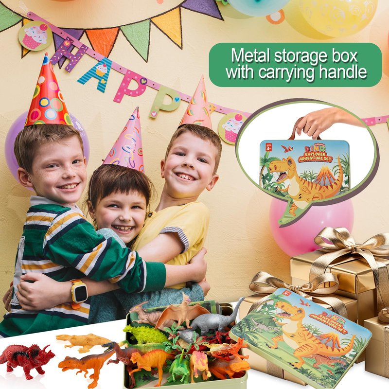 <p>Interactive Play Experience: This dinosaur toys for kids 5-7 goes beyond just figures; it includes an engaging play map and realistic accessories such as plastic trees, dinosaur eggs, and stones. These additional elements enable children to create elaborate scenes and stories, enhancing their playtime with a rich narrative component. This interactive play helps develop storytelling skills and encourages cooperative play when shared with friends, making it a perfect set for imaginative exploration.</p><p>Versatile Use: Turn any event into a dino-mite celebration with these versatile animal figures for toddlers 3-5. Perfect for dinosaur-themed parties, these boy toys can be used as eye-catching decorations like birthday cake toppers, exciting party favors, or interactive game pieces are sure to be a hit with young guests. Their realistic design and engaging play potential make them also ideal for perfect gift choice. </p><p>Portable Storage Box: Designed with convenience in mind, the kids dinosaur toy kit comes with a metal storage box featuring a vibrant dinosaur design. This durable and portable case not only keeps all the pieces organized but also allows kids to take their dino adventures on the go. Whether heading to a friend's house, a family trip, or simply storing the toys neatly at home, the storage box makes it easy to transport and keep the set intact.</p><p>Reliable Support: Please reach out to us if you encounter any issues with our t rex dinosaur toys, we are committed to resolving your concerns swiftly.</p>