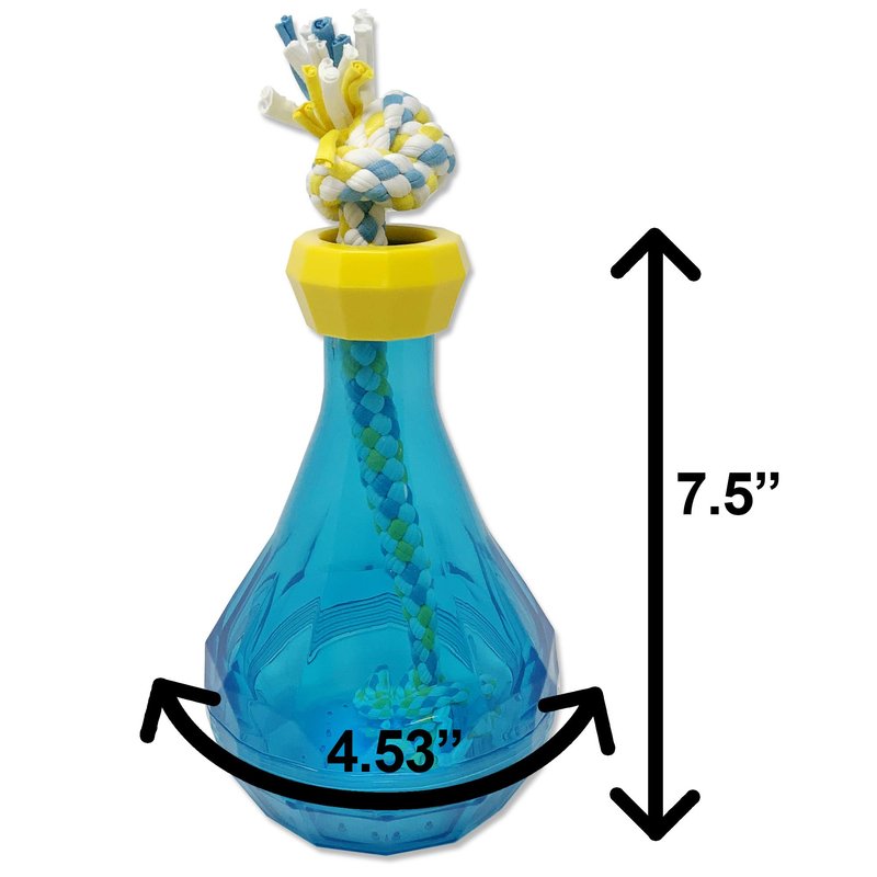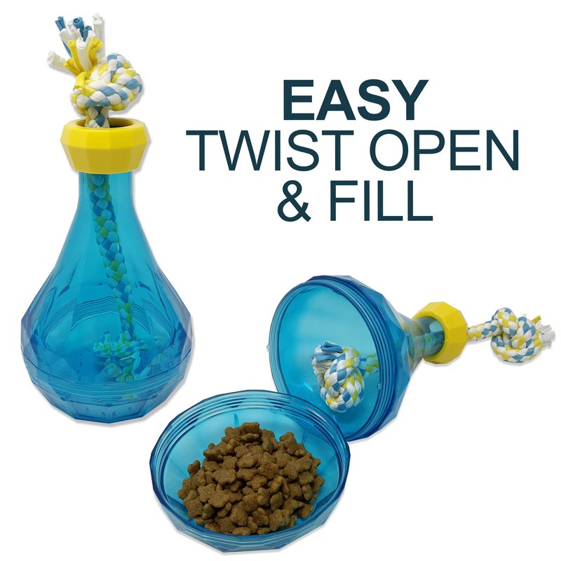 - MENTAL STIMULATION: Exercise your dogs brain with this dog food dog treat dispensing puzzle toy rope dog toy. Just place your dogs favorite treats or dog food in a bottle and keep your pup not only busy but this will also help by redirecting destructive behaviors. Dog puzzle toys are not only fun but they also strengthen your dog's cognitive abilities. A great alternative for snuffle mats for dogs or traditional dog rope toys. |DOG SLOW FEEDER: This treat and food dispensing dog slow feeder dog toy can be used to feed your dog healthy snacks or dry kibble solving the food puzzle creates an engaging slowed down mealtime.The double bottle rope dog toy can also be used as interactive dog food bowls great for dogs that eat too fast and for dogs that refuse to eat they will often eat more when using this to work for food. |BONDING WITH YOUR PET: Your dog loves playing with you. Create a true bonding experience with this interactive dog treat dispenser you can join your pup in finding his puppy treats or play tug of war. Your pet craves love and attention and this is the perfect interactive dog toy to connect over. This dog puzzle rope dog toy is sure to keep your pet busy and entertained while enjoying your company. |PROMOTES DENTAL HEALTH: Made of fibers that not only make chewing these rope dog toys fun but help with cleaning teeth while supporting dental health. Chewing on the rope helps remove plaque from your dogs teeth helping to keep teeth and gums healthy. Great for interactive play and to help support healthy teeth and gums. |MADE OF HIGH-QUALITY MATERIALS: This dog toy is made of high quality sturdy and durable materials designed to tolerate the usual energy of your dog. We Strongly recommend supervised use; this will help toys last longer and most importantly keep your dog safe. Remove and replace the toy if damaged.