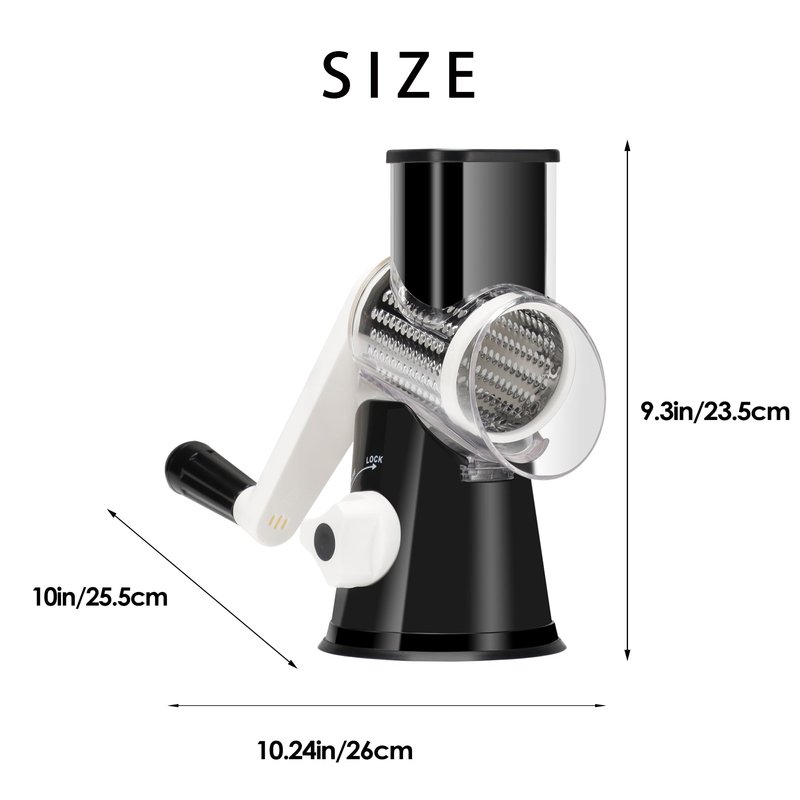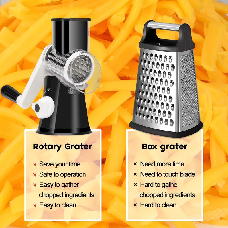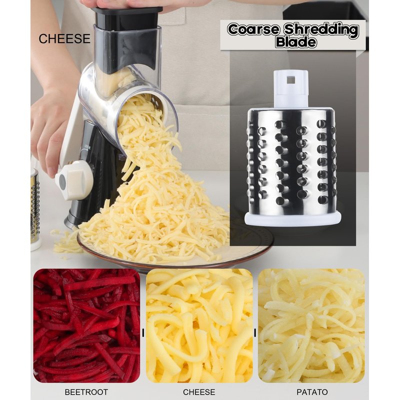 - 𝟑 𝒊𝒏 𝟏 𝑯𝒂𝒏𝒅 𝑪𝒓𝒂𝒏𝒌 𝑪𝒉𝒆𝒆𝒔𝒆 𝑺𝒉𝒓𝒆𝒅𝒅𝒆𝒓: The multifunctional grater enables it to serve as a substitute for numerous single-purpose kitchen tools. Equipped with 3 drum blades -a fine shred blade, a coarse shred blade and a slice blade, the manual cheese grater is suitable for many ingredients such as cheese, potato, carrot, cucumber, zucchini, cookie, beetroot, radish, nuts, garlic, chocolate etc., for pizza toppings, salad, cauliflower rice, hash browns and more.