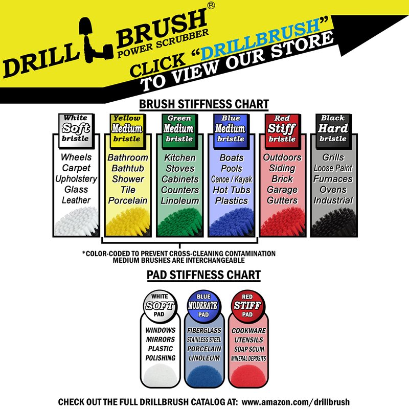 - Pad Combo Brush Set: This set includes 3 cleaning brushes for drills in our stiff red to insure you have the correct size to turn your drill into an outdoor cleaning machine. This kit also includes 3 different types of pads, our white soft, moderate red, and stiff blue, to insure you have the right stiffness to tackle even outdoor window cleaning needs. Our best-selling original bullet shaped brush is great for contours and crevices. The 2-inch flat great for smaller space detailing cleaning.