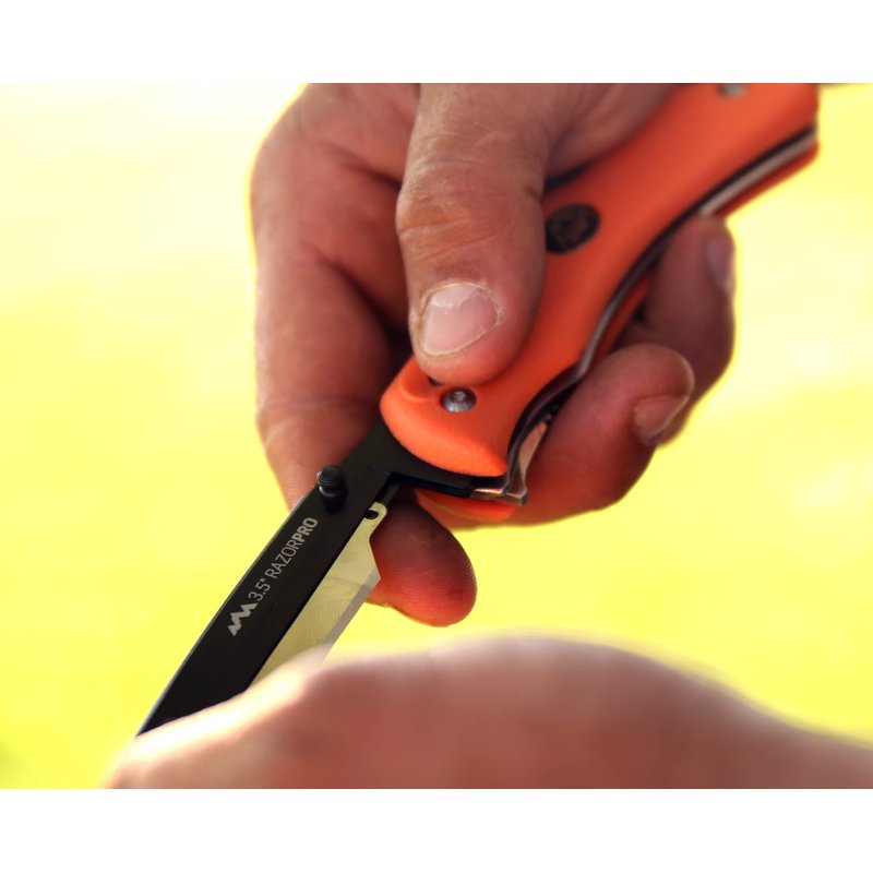 - TWO BLADES IN ONE HUNTING KNIFE – The RazorPro folding knife is destined to become one of your favorite hunting accessories. It boasts two blades in one, featuring a replaceable blade on one side and a unique gutting blade on the other. The gutting blade is specifically designed to cut underneath the skin, allowing for easy game opening akin to a zipper.