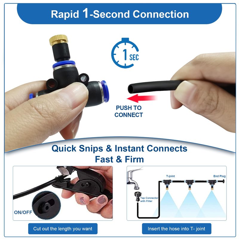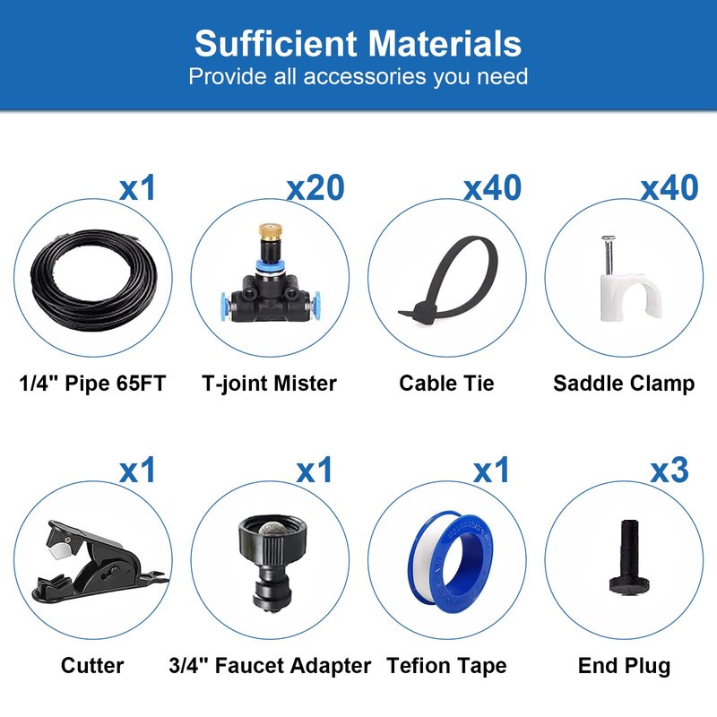 - 【DIY your own cooling system】This US standard mister for outside can be used as outdoor cooling systerm for patio, fan, umbrella, porch, pergola, vestibule, animals, or use as garden irrigation kit. Cools the surrounding air temperatures up to 20℃ or 68℉.