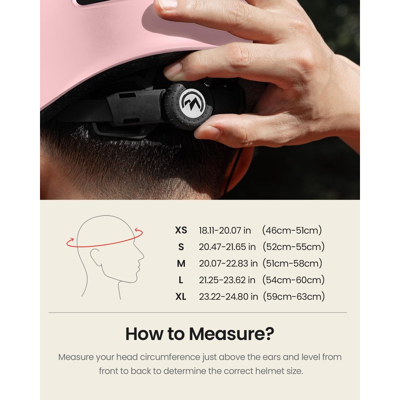 - How to Measure A Proper Helmet: To find the right size bike helmet, start by measuring your head circumference, wrap a flexible tape measure around the largest portion of your head about one inch above your eyebrows. Or, wrap a string around your head, then measure the length of string with a yardstick. Size Large is recommended if your size is between 21.3-22.8 inch (54 cm-58 cm). The recommended Age Grading: 5 Years and Older