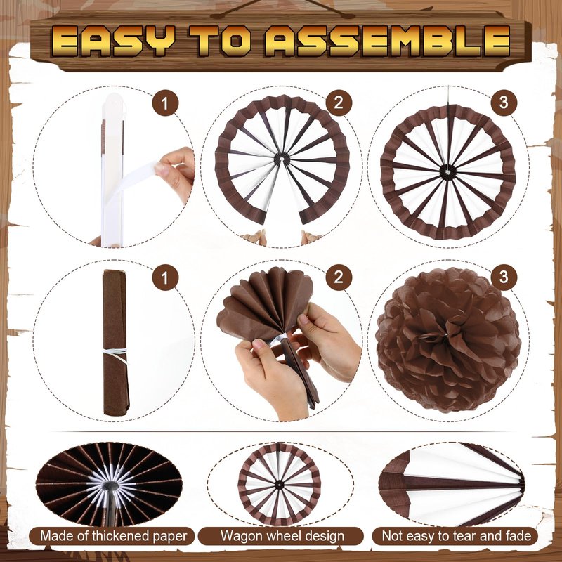 - What You Get: you will receive 21 pcs wild western hanging decorations, including 9 pcs wagon wheels paper fans and 12 pcs brown tissue pom poms, sufficient quantity and various sizes, can hang together for a visual display, bright up your western party