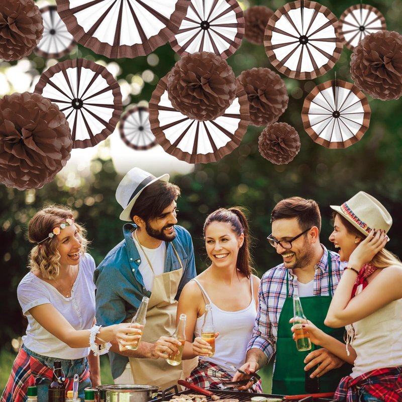 Outus 21 Pcs Western Party Hanging Decoration Wagon Wheel Paper Fans Brown Paper Pom Poms Country Western Hanging Fans Tissue Paper Flower for Wild Western Cowboy Themed Birthday Party Supplies Decor