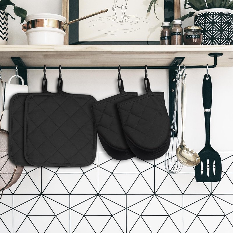 - 4 PIECE GREAT VALUE HOUSEHOLD ESSENTIALS PACK: Super value for 4pcs short oven mitts and pot holders, including 2 oven mitts(6.8 x 5.3in) and 2 pot holders (6.6 x 6.6in), perfect for daily use and coordinate well with your house and kitchen.
