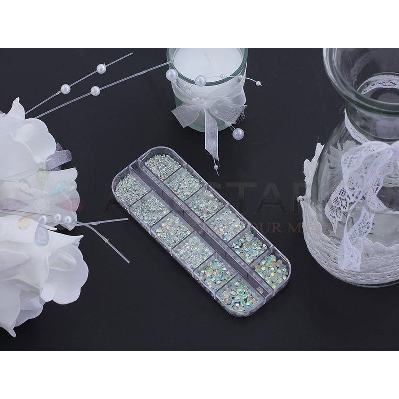 Allstarco's Over 2100 flat back glass rhinestones in 6 different sizes. This product includes 1 storage box of flat back crystals of the chosen color. Material: Glass Crystal. Great for salons nail art, diy projects, embellishments, face art, crafts, wedding, bling, phone, accessories etc. Most popular Sizes: SS4 (1.4mm) - 600 Pieces, SS6 (2mm) - 600 Pieces, SS8 (2.5mm) - 400 Pieces, SS10 (2.9mm) - 400 Pieces, SS16 (4mm) - 100 Pieces and SS20 (4.8mm) - 50 Pieces. These rhinestones are not hot fix rhinestones, use your OWN glue (Glue is not included).