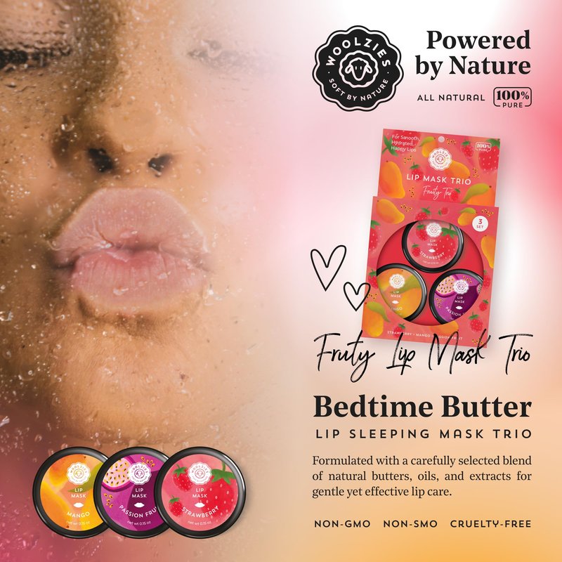 Are you tired of waking up to dry, chapped lips? Say goodbye to lackluster lips and hello to plush, hydrated perfection with our Woolzies Fruity Overnight Lip Masks Trio. Infused with a decadent blend of natural ingredients, our lip masks work tirelessly while you sleep to provide intense hydration and nourishment.