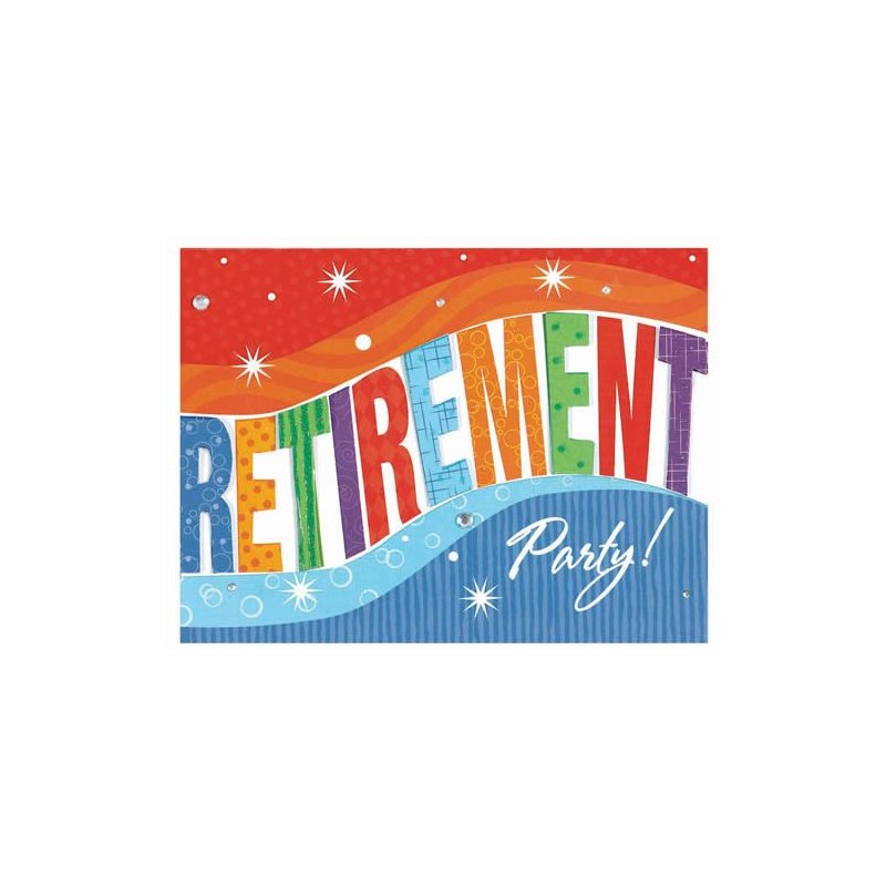 Invite friends and family to a special celebration with our Retirement Jumbo Invitations! The front of each invitation features a colorful background with the message "Retirement Party". Inside there is plenty of room for all the details! Includes 8 invitations and envelopes per package.
