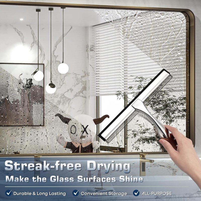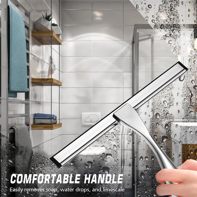 - Built to Last: Crafted from 100% rust-resistant stainless steel and featuring a premium silicone blade, our squeegee ensures durability and long-lasting use. This bathroom squeegee for shower glass doors is an essential tool, perfect for window squeegee for window cleaning as well as maintaining the sparkle of shower glass doors.