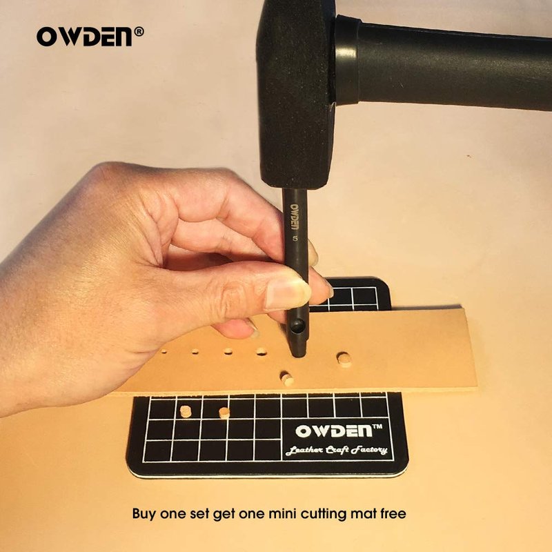 OWDEN Professional 6Pcs. leather hollow punch set. Size: 1.0-1.5-2.0-3.0-4.0-5.0mm for leather belt, Watchband leather strap gasket. With a free mini cutting mat. This Tool has a slim design to better maintain the verticality and smooth for the leather hole. Punch size is very accurate.