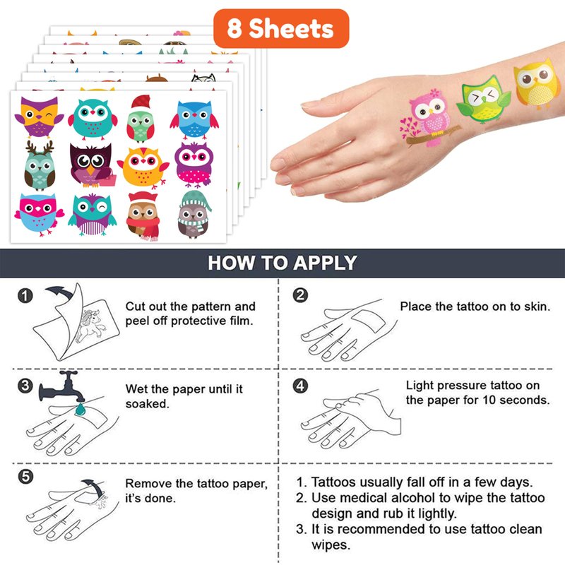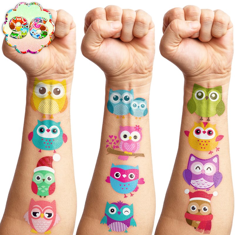 🦉【PERFECT TATTOOS FOR THEMED OWL DECORATIONS】: Owl temporary tattoo stickers include 8 sheets in total. There are 96Pcs super cute tattoo differences. Perfect for giving out party favors and holiday theme small gifts. The size of each sheet is 6.1 * 3.1 inches. One size fits kids. 🎁【GREAT GIFT IDEAS FOR OWL PARTY SUPPLIES AND DECORATIONS】: You will receive many compliments when you decorate your child's birthday party with a Owl theme. Owl tattoos are a small gift you should not pass up for your kids. 🥳【ADD A TOUCH OF FUN】: Are you tired of mundane gifts? We've got you covered! Our collection of adorable and vibrant temporary tattoo designs can be applied to laptops, backpacks, desks, suitcases, books, water cups, and more. These playful elements will surely elevate your visual experience and bring a touch of joy to everyday items. 🌍【SAFE AND ENVIRONMENTALLY CONSCIOUS】: Our temporary tattoos are made from materials that are safe and prioritize sustainability. These tattoos are created using paper that is both safe for users and friendly to the environment. 🌴【EASY TO USE AND REMOVE】: Cut each tattoo out of sheets and remove the sheet clearly. You can stick it on hands, face, arms or wherever you feel safe. Moreover, you put it down on glasses, clothes, and a smooth flat . After that, you wet it thoroughly with water and wait for 20-30 seconds, you get rid of the backing paper. As a result, you have a velvety tattoo as we say. 👍【PERFECT SERVICE】: If you have difficulty using our product, contact us. We will make sure to solve problems and help you have a wonderful buying experience.⚠️This product is not recommended for individuals with sensitive skin. We advise testing the product on a small patch of skin, such as the hand, to check for any allergic reactions to the ingredients before applying it to other areas of the body