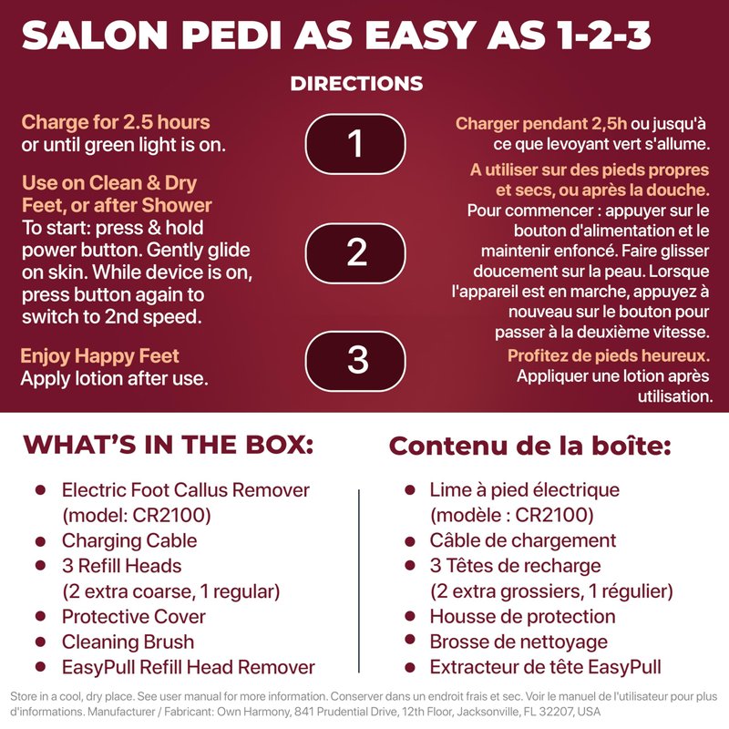 - HAPPY FEET TIPS: Charge for 2.5 hours; Use on clean and dry feet, or after shower; Gently glide roller on heels, toes and soles of feet – do not apply pressure; Use extra coarse roller for heavy callus build-up; Use regular coarse roller to maintain smooth & soft feet
