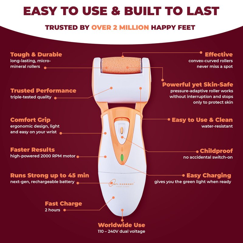 - HAPPY FEET TIPS: Charge for 2 hours; Use on clean and dry feet, or after shower; Gently glide roller on heels, toes and soles of feet – do not apply pressure; Use extra coarse roller for heavy callus build-up; Use regular coarse roller to maintain smooth & soft feet