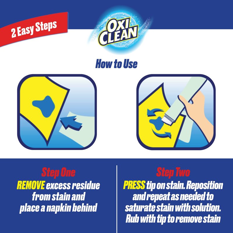 - 2 STEP PROCESS: Simply remove any residue from the stain, place a napkin behind it, squeeze the pen, and scrub to eliminate the stain.