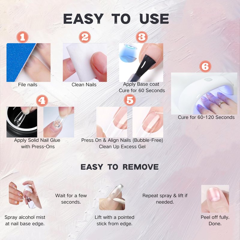 - Long-Wear & User-Friendly - The solid nail glue gel feels like rubber, gentle on nails, non-drippy, and easy to handle. UV-curable for strong adhesion, it's repositionable before setting and lasts beautifully for weeks with proper use.