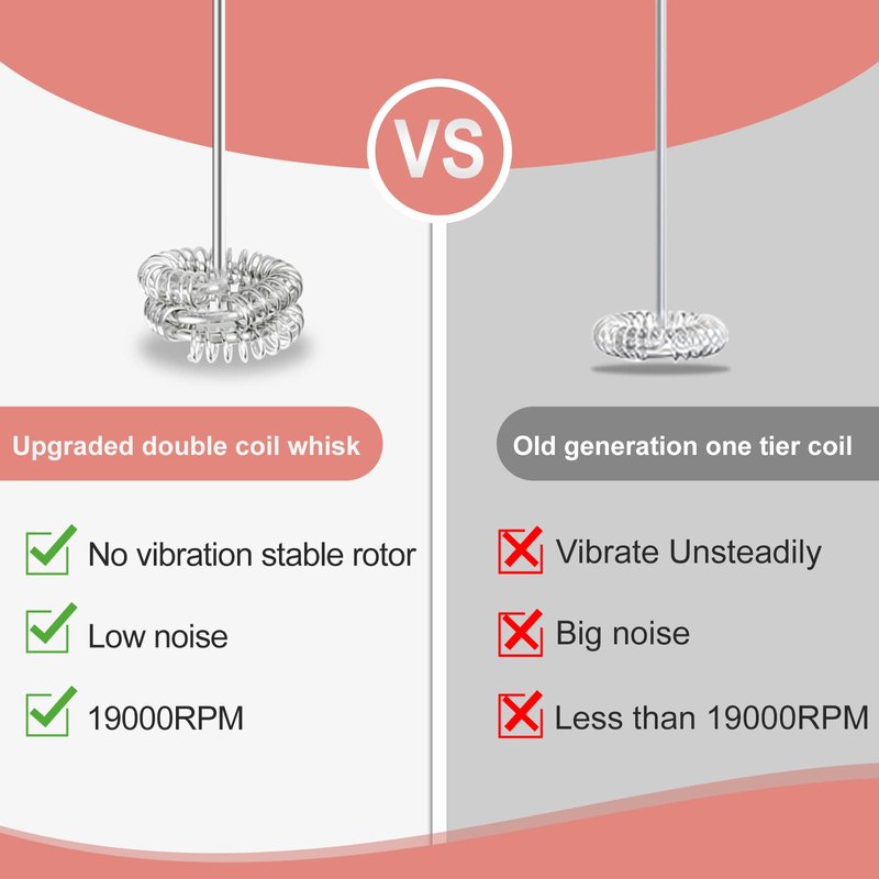 - [ UPGRADED DOUBLE WHISK NEW GENERATION ]--This retrofitted double whisk and redesigned frothing wand, which can stir richer milk foam faster,makes you get endless benefits at home. And the rotor head is made of safe food grade stainless steel, always taking care of your health.The powerful and high-speed motor rotates stably with low-noise. Compared with the previous generation of single coil rotor head, the upgraded double coil rotor vibrates very little when rotating.