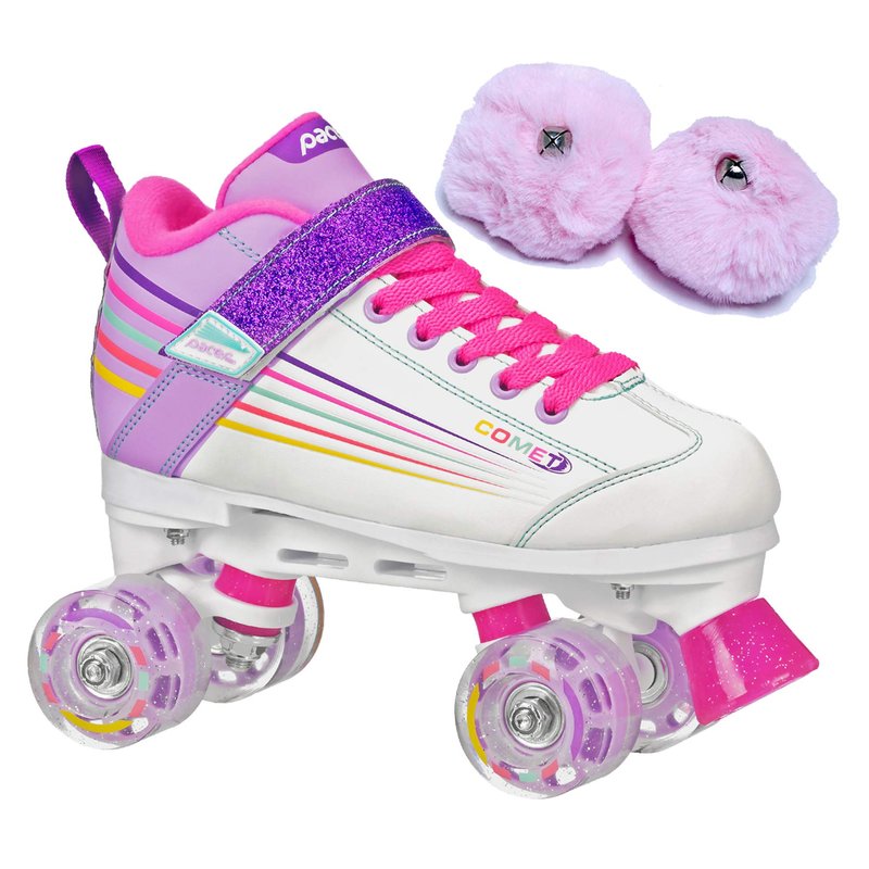 The Pacer Comet Girls Light Up Skate is paired with a set of Baby Pink Pom Poms for the perfect gift for the child who loves to roller skate or is just beginning to skate. The Pacer Comet Light Up skates are perfect for any child for birthday or Christmas. These kids light up skates will definitely get you noticed at the rink. At Christmas time this is one of the most popular roller skates given to kids. The Pacer Comet features a comfortable boot with 4 wheels that light up around the outside. These flashy Comet light up skates are definitely worth the few dollars it costs to acquire such a spectacular gift. Make them remember this Christmas or birthday - get them the Pacer Comet Girls Light Up Skates! - SIZING: These skates come in unisex kids sizes and may run a little bit small so we recommend that you order one size larger than your child's normal shoe size. This will also allow room for growth.