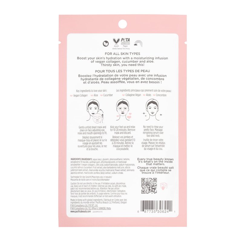 - SKIN LOVING INGREDIENTS this mask contains Vegan Collagen which is Pacifica's patented fermented plant-peptide that adds rich hydration and leaves skin looking dewy and fresh​ and Cucumber & Aloe for cooling & soothing effect.