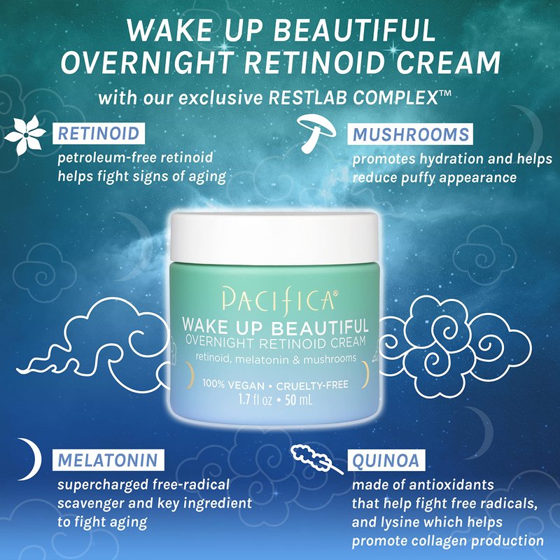 - WAKE UP BEAUTIFUL OVERNIGHT RETINOID CREAM Sleep pretty knowing our Wake Up Beautiful Retinoid Cream is working over-time. This light-as-a-pillow, nighttime moisturizer is packed with potent ingredients to help hydrate and repair skin while you sleep. Our patented RestLab ComplexTM combines a powerhouse of natural and clinically studied ingredients to address signs of aging and hydrate skin so that you can wake up feeling and looking beautiful.