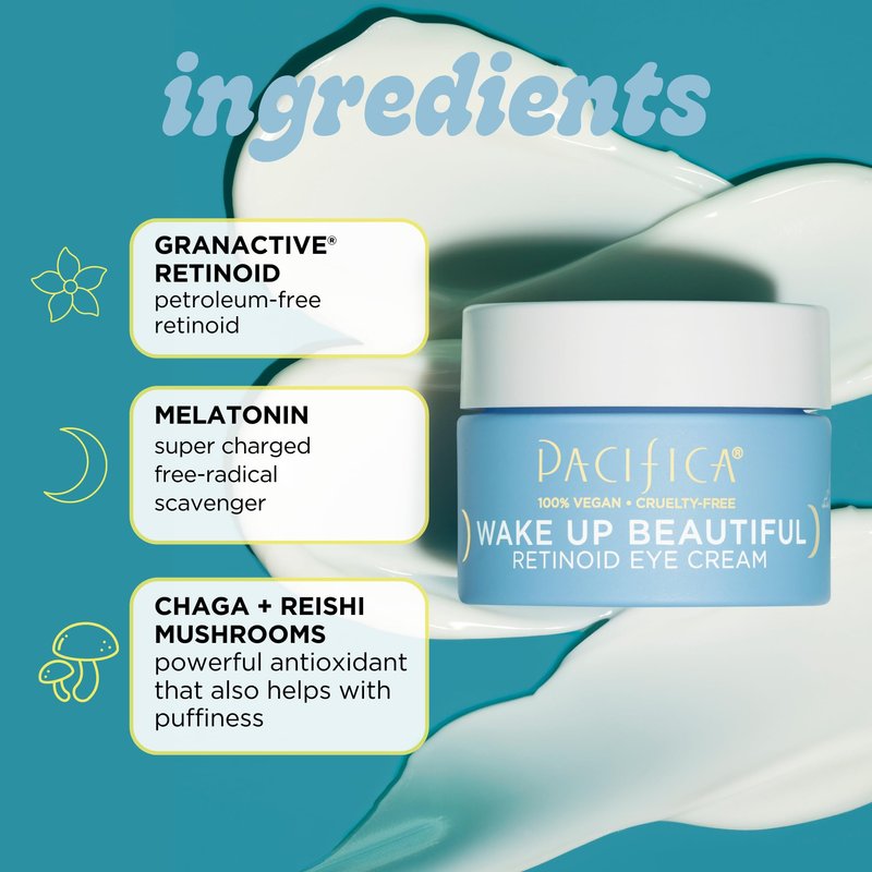 - WAKE UP BEAUTIFUL RETINOID EYE CREAM Get the most out of your beauty sleep and wake up to dreamy skin. This retinoid, melatonin and mushroom-powered eye cream is a super-charged formula designed to address multiple signs of aging. Petroleum-free Granactive retinoid is known for being gentler on skin. This fast-absorbing, rich formula provides super hydration while being gentle on your under-eyes. Sleep pretty knowing your eye cream's working overtime.