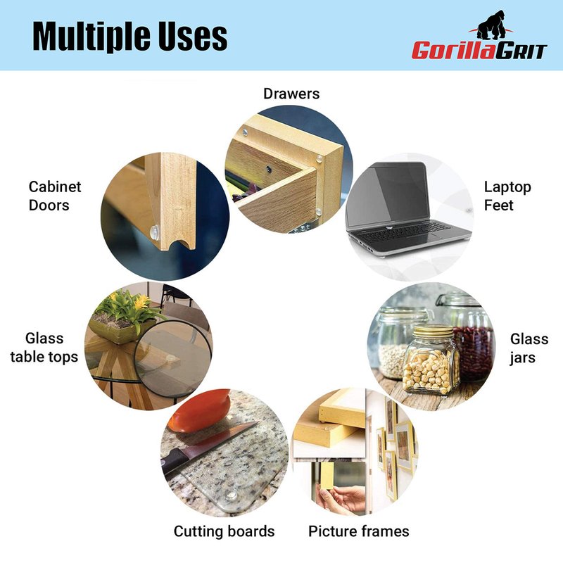 Applications include Cabinets, Drawers, Glass Products, Picture Frames, Cutting Boards, Sliding Doors, Furniture, Windows, Wall Hangings, Plastics, Small Appliances, Audio & Video Equipment, Computers, Laptops, Wall Protection, Corner Protection and many other uses at Home and Office.