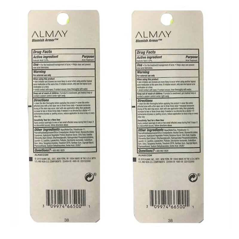Pack of 2 Almay Clear Complexion Blemish Armor Salicylic Acid Acne Treatment, # 100 It's lightweight, liquid spot treatment contains maximum-strength salicylic acid, a gold-standard acne-fighting ingredient, to help clear blemishes and prevent new breakouts from emerging 0.13 fl oz / 3.8 ml x2 Made in USA