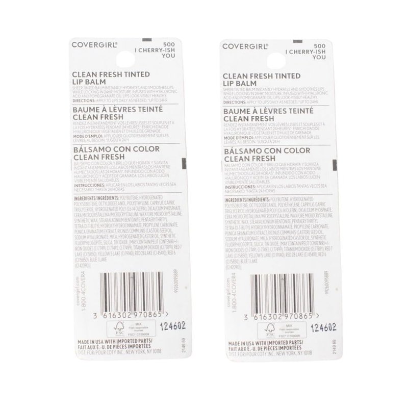 - Pack of 2 CoverGirl Clean Fresh Tinted Lip Balm, I Cherry-Ish You 500 Sheer tinted balm instantly hydrates and smoothes lips while locking in 24HR moisture Infused with hyaluronic acid and pomegranate oil. Lips look visibly healthy. 4.1 g / 0.14 oz x2 Made in USA
