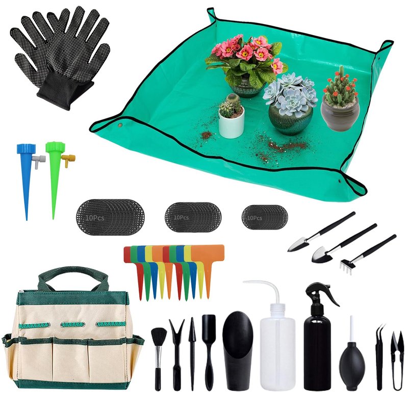 - 【Complete set of garden tools】You will receive 1 piece 25.9 × 25.9 inches green plant transplanting tarp mat, 1 gardening tote, 2 watering artifacts and 13 different mini succulent tools, including shovel, shovel, stand, hair dryer , scissors, curved drip bottle, gardening gloves, 10 plant labels, etc., 30 plant pot mesh mats (3 sizes: 1.4 inches, 1.8 inches, 3 inches) to meet your different needs in various occasions.