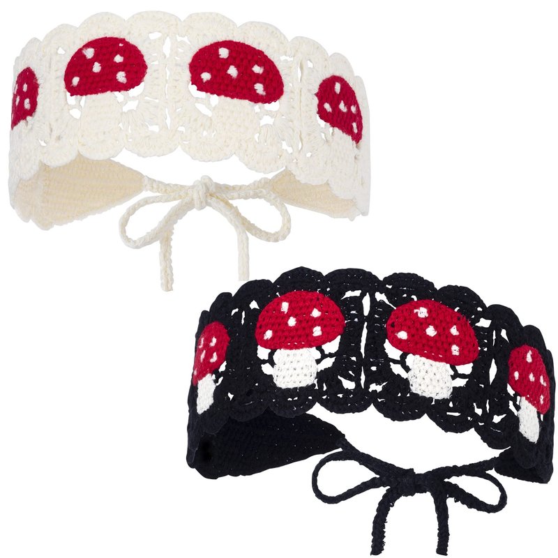 PAGOW 2Pcs Crochet Headbands for Women, Hippie Mushroom Crochet Hair Bandana, Vintage Handmade Knit Hairband Breathable Head Wrap for Girls(White+Black)