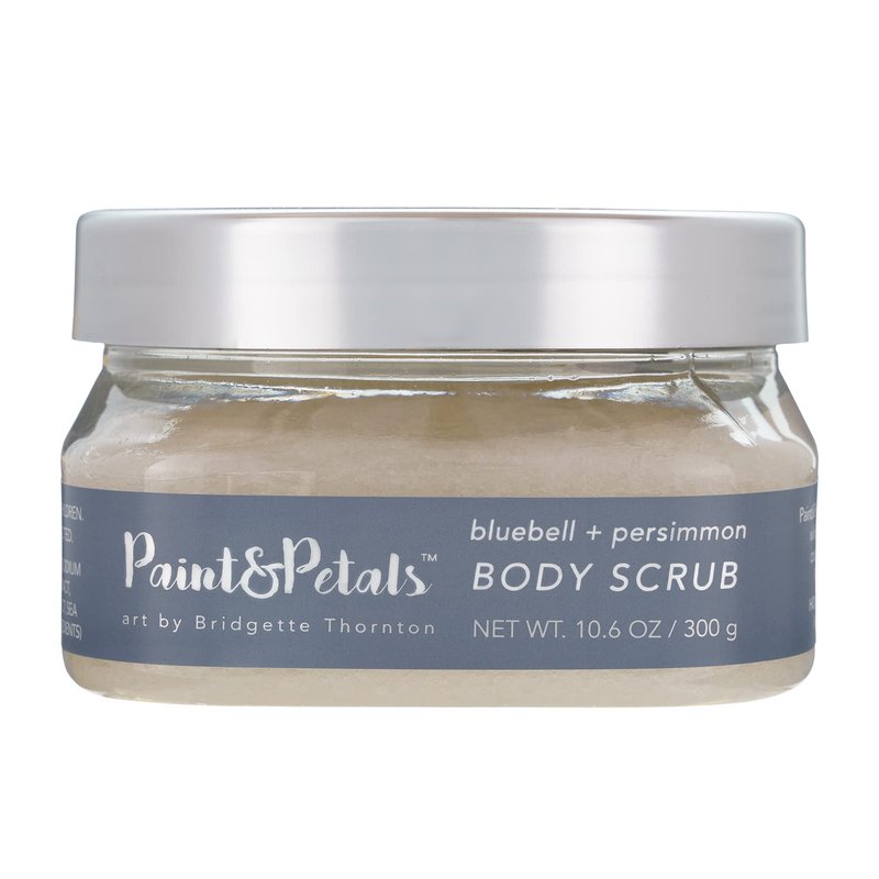 - Paint&Petals body scrub gently exfoliates with salt and sugar crystals while simultaneously nourishing skin with shea butter, delicious coconut oil and bluebell and persimmon extracts resulting in a radiant glow. Made for all skin types; Free of parabens, sulfates, dyes, phthalates and silicones.