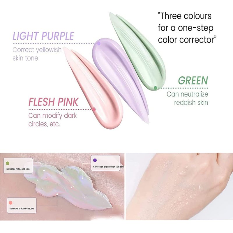 - 【Tricolor Facial Primer】 Containing 3 color-correcting pigments to even out the complexion. Light purple can correct yellowish skin tone, green can neutralize reddish skin, flesh pink can modify dark circles, etc.