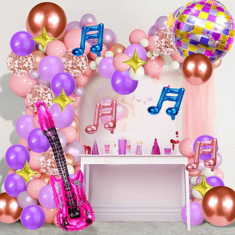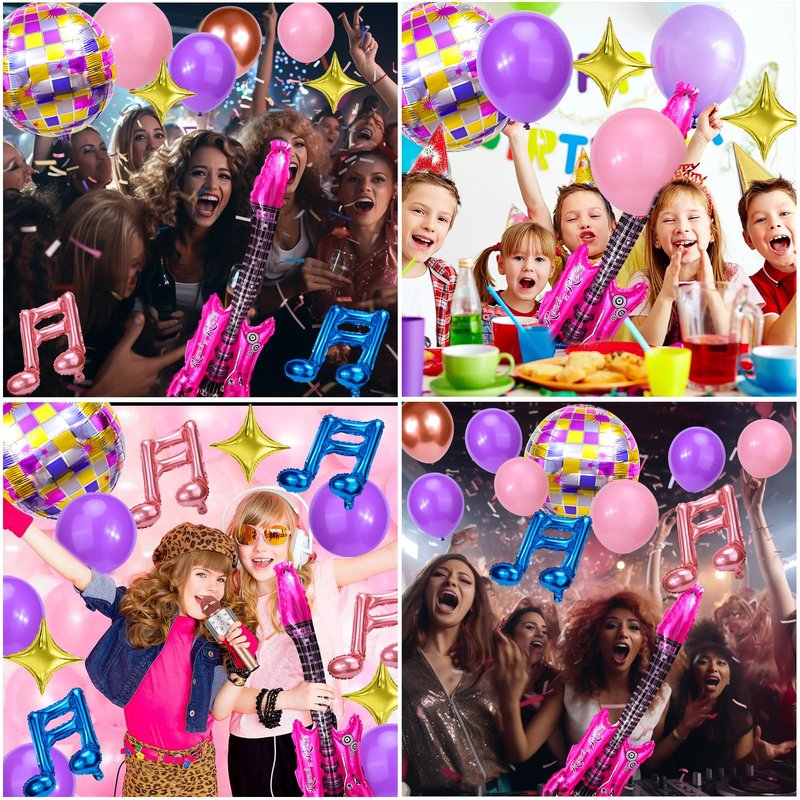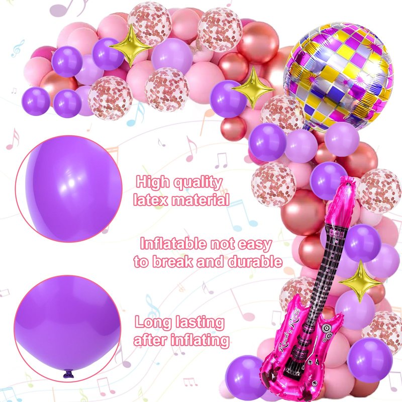 - The Set Includes: 1 guitar foil balloon, 5 star foil balloons, 1 large disco foil balloon, 4 musical note balloons, and 120 latex balloons, including 50 in 5 inches, 40 in 10 inches and 30 in 12 inches. , including purple, macaron purple, macaron pink, metallic rose gold, pink sequins and other colors to meet your decoration needs. You can turn any space into a stunning party venue!