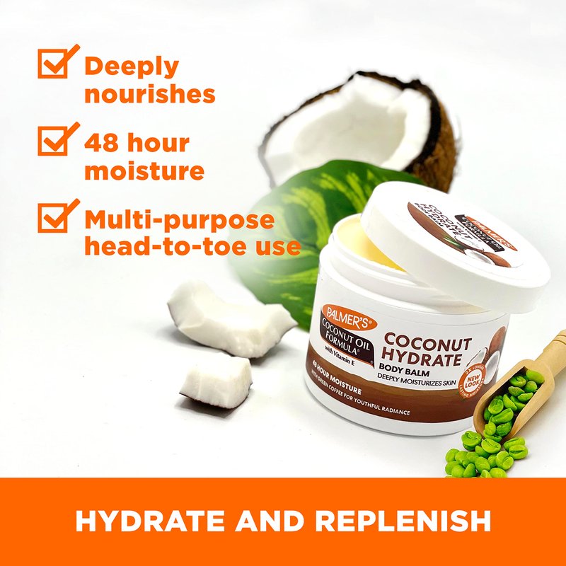 - Natural Formula: Crafted with Extra Virgin Coconut Oil and Green Coffee Extract to moisturize even the roughest, driest skin, this balm nourishes and hydrates head to toe, from dry cuticles to cracked heels