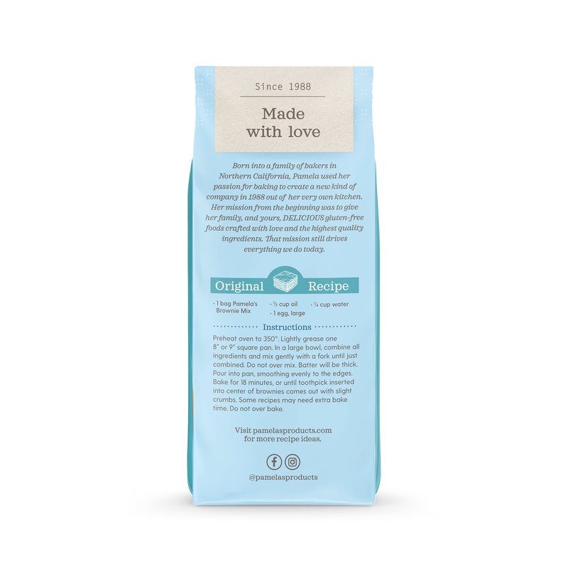 - Pamela’s Chocolate Brownie Mix creates rich, fudgy gluten-free brownies with chocolate chunks; Just add mix to oil, water and egg for an 8-9 inch pan of warm and deliciously decadent kosher brownies