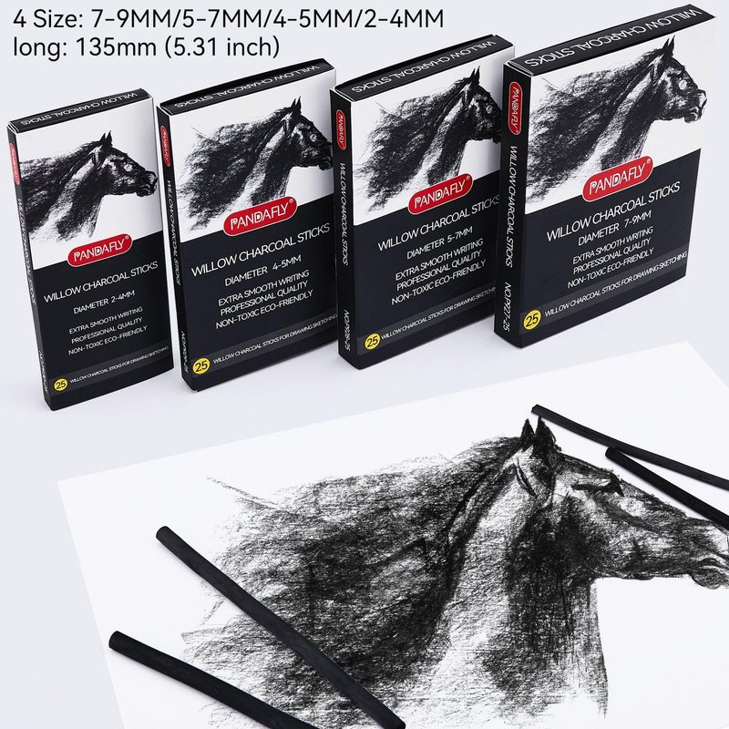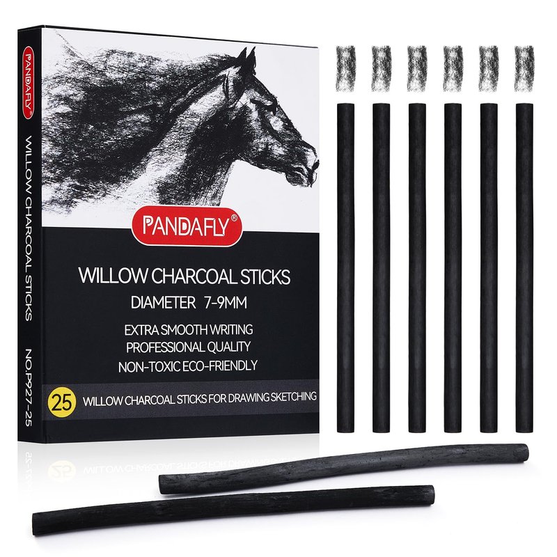- PREMIUM WILLOW CHARCOAL STICKS - Willow charcoal sticks are a natural product made of carbonized willow rods. Each box comes with 25 pieces of charcoal sticks. Great for create wispy sketches and smoky drawings.