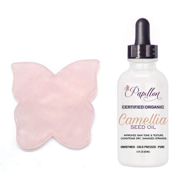 Camellia Oil The luxurious USDA certified Camellia oil is high in oleic acid (Omega – 9), antioxidants, anti-aging plant collagen, and minerals. It helps condition, nourishes, and protects the skin; giving you a glowing and radiant complexion. This oil is widely used in Asia and is considered to be one of the most treasured beauty secrets of Japanese Geishas. The oil is light, non-greasy, and is quickly absorbed into the skin. Camelia Oil is imported from Japan and bottled in the USA. Ingredients: 100% USDA Certified Organic Camellia Oil Butterfly Gua Sha This butterfly-shaped gua sha facial tool by Papillon is made of nurturing rose quartz, a stone associated with empathy, compassion, and the heart. An ancient Chinese beauty and wellness tool, this gua sha can be used to show your skin more compassion and love, with daily facial massages to promote circulation and give your complexion a youthful glow. Like the butterfly after which it takes its shape, this gua sha tool comes from nature. It’s designed to enhance the beauty you already have, using all-natural self-care and massage techniques. Rose quartz is associated with love for yourself and others, as well as with forgiveness, compassion, and with the clearing of negative emotions that weigh on the heart. In many ways, it epitomizes what self-care stands for, and its positive energy can add an extra-relaxing, pampering note to your beauty routine. You can even just hold the rose quartz gua sha between your palm when meditating to draw on the self-love and self-acceptance energy from the stone. Whether you’re looking to adopt a new self-care practice to add to your routine, are curious about the lauded benefits of gua sha for your skin, or just think that the idea of a relaxing facial massage tool that you can use at home sounds heavenly - you won’t regret welcoming this beautiful butterfly gua sha into your beauty routine.