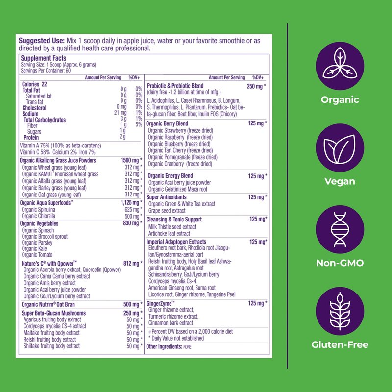 - Easy Prep: Mix 1 scoop in water or smoothies for power-packed nutrition; Non-GMO, gluten-free with no fillers or binders; Made with pure & wildcrafted organic ingredients
