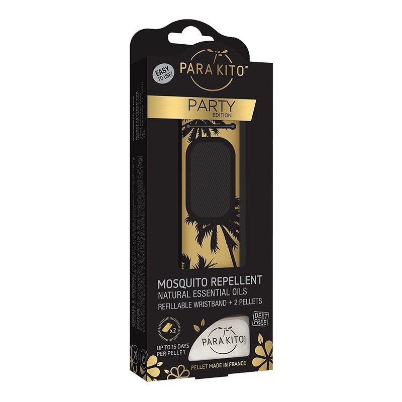 PARA’KITO Party Edition is a premium edition of mosquito repellent bands you feel proud of wearing at a party, even when wearing a cocktail dress. Whether you are going to a nice dinner party, enjoying a night out with friends or having a glass of wine while looking at the sunset, why not protect yourself from mosquitoes in the most trendy and fashionable way? This new light and beautiful wristband helps protecting you from mosquitoes and blends in with your party dress. PARA’KITO Party Edition is a trendy and shiny collection of designs mixing black, white, gold and silver, which were inspired from the latest fashion trends. The Party Edition wristbands fit everyone’s wrist. The band is very thin. Lightweight, it comes with a hook & loop closure allowing you to adjust size for your comfort. Contains 34% citronella oil, 22% rosemary oil, 21% geranium oil, 10% mint oil, 2.5% clove oil, 1.5% peppermint oil and 1% cinnamon oil. Proprietary formula is free of DEET, GMOs, gluten, paraben, phthalates, and animal testing. Additional refill pellets sold separately.